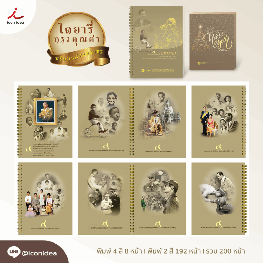 ไดอารี่ทรงคุณค่า ทศวรรษนวมินทร์มหาราชา250.00 ฿ไดอรี่สุดพิเศษที่ร้อยเรียงความทรงจำและพระบรมฉายาลักษณ์ของพระบาทสมเด็จพระเจ้าอยู่หัว รัชกาลที่ 9 ไว้อย่างงดงามและทรงคุณค่า ด้วยดีไซน์หรูหราสีทองอร่าม แสดงถึงความจงรักภักดีและสำนึกในพระมหากรุณาธิคุณอันหาที่สุดมิได้ ภายในประกอบด้วยภาพพระบรมฉายาลักษณ์หายากในหลากหลายพระราชกรณียกิจ ตั้งแต่ทรงงาน ทรงกีฬา ทรงเยี่ยมราษฎร ไปจนถึงภาพแห่งความอบอุ่นในพระราชวงศ์ ซึ่งแต่ละภาพถูกคัดสรรอย่างพิถีพิถันและจัดวางบนพื้นหลังสีทองดูสง่างาม เหมาะแก่การสะสมหรือมอบเป็นของขวัญที่เปี่ยมด้วยความหมาย
